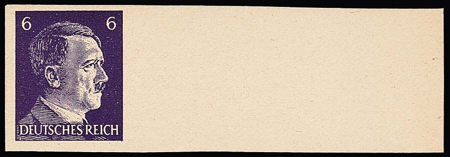 6 Pfg. Hitler, in der Schweiz von der OSS hergestellte Amerikanische Fälschung für Deutschland, seltene geschnittene Variante postfrisch mit 55mm breitem Bogenrand rechts, Michel ohne Bewertung