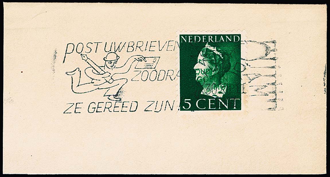 Fälschungen Niederländischer Widerstandsorganisationen für das von Deutschland besetzte Gebiet, 5 C. Wilhelmina mit Aufdruck "Houdt Goeden Moed" auf Briefstück. Sehr seltene, im Michel nur mit "-.-" bewertete Fälschung. Attest Pieles