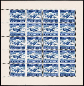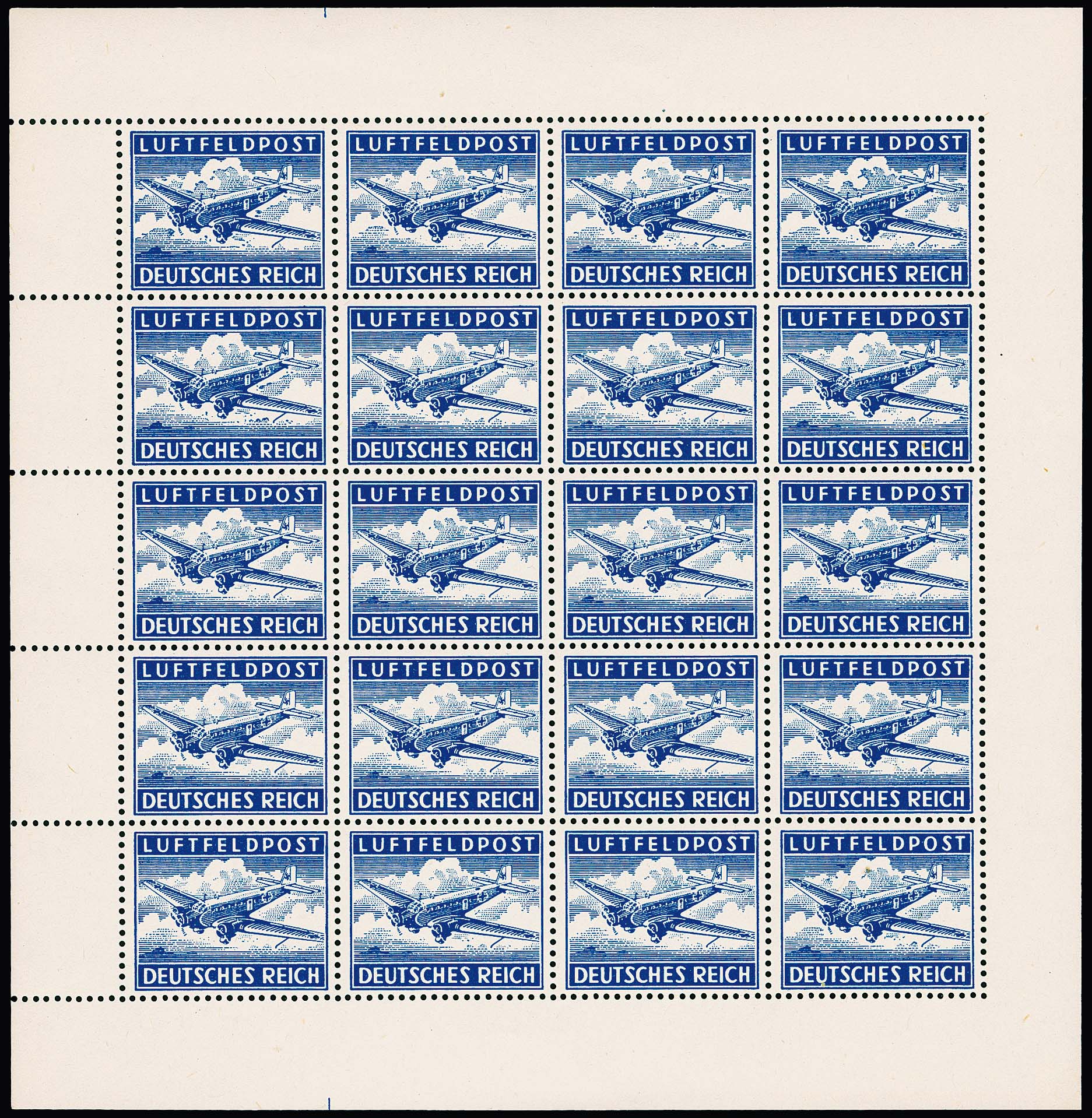 Britische Fälschungen für Deutschland, Kriegspropaganda-Fälschung der Luftpost-Zulassungsmarke im kompletten postfrischen Bogen, nur noch wenige vollständige Bogen existent und selten, wie auch das Attest Pieles bestätigt. Michel der losen Marken 3000,- +