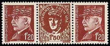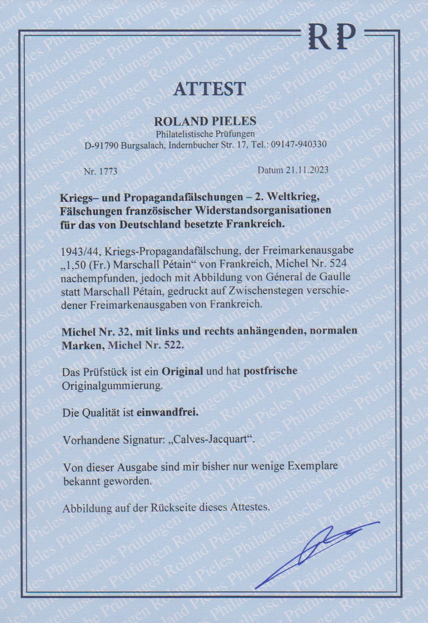 1,50 Fr. De Gaulle, Fälschung französischer Widerstandskämpfer-Organisationen für das von Deutschland besetzte Frankreich, gedruckt auf dem Zwischensteg der Urmarke 1,20 Fr. Petain, tadellos postfrisch, sign. Calves-Jacquart und Attest Pieles "mir bisher nur wenige Exemplare bekannt" und im Michel mit 2200,- hoffnungslos unterbewertet