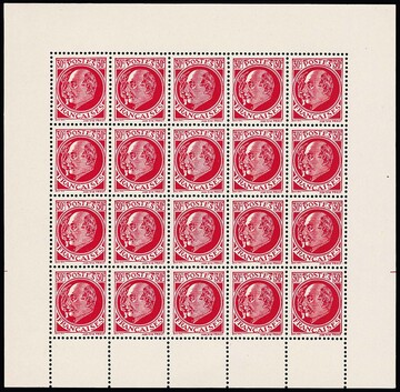 30 C. dunkelkarminrot, Petain ohne Kappe, Britische Fälschung für das von Deutschland besetzte Frankreich, im kompletten postfrischen Bogen zu 20 Exemplaren. Mi. nur der losen Marken 3600,-, hervorzuheben ist, dass nur wenige vollständige Bögen, zumal in tadelloser Erhaltung, existieren und einen deutlichen Aufschlag auf die lose Markenbewertung erfordern. Attest Pieles