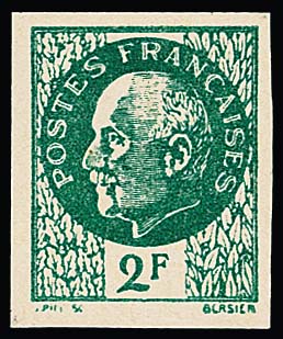 Britische Fälschungen für das von Deutschland besetzte Frankreich, 2 Fr. grün, Petain, trockener Druck, geschnittener Probedruck in tadelloser Erhaltung. Bisher sind nur vier solcher Probedrucke bekannt, die - wie das vorliegende Stück - aus einem aufgetrennten Eckrand-Viererblock stammen. Im Michel nicht gelistet und große Seltenheit der Kriegspropaganda-Ausgaben. Sign. Mayer und Attest Pieles