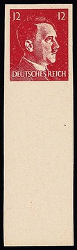 12 Pfg. Hitler, in der Schweiz von der OSS hergestellte Amerikanische Fälschung für Deutschland, seltene geschnittene Variante ungebraucht mit 52mm breitem unterem Bogenrand, Michel ohne Bewertung