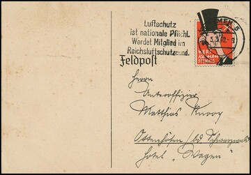 Halboffizielle "Feldpost"-Propagandakarte mit gedrucktem Karikatur-Wertstempel und Abb. von Neville-Chamberlain, "WERT keinen PFENNIG", vom Werbegrafiker Heinz Fehling (nicht zu verwechseln mit den späteren Karten des Ashelm-Verlages), gebraucht in typischer Bedarfserhaltung ab Bremen, 5.3.1940. Bisher sind erst fünf weitere Karten dieser Art registriert, davon ist die vorliegende die früheste bekannte! Im Baldus-Handbuch auf S. 10 abgebildet (A6). Attest Pieles