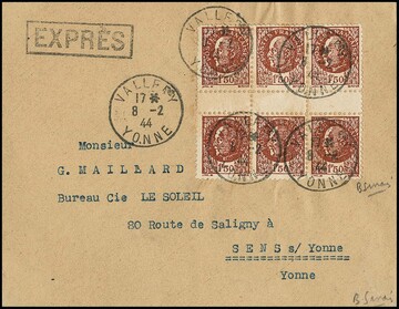Fälschungen französischer Widerstandsorganisationen für das von Deutschland besetzte Frankreich, 1,50 Fr. Petain, rotbraun, im Sechserblock mit drei senkrechten Zwischenstegpaaren auf Expreßbrief aus Vallfey/Yonne, 8.2.44 (zeitgerecht vor dem 2.6.44). Sehr selten und schon lose gestempelt im Michel nur mit "-.-" bewertet. Sign. B. Sinais