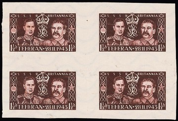 Deutsche Fälschungen für Großbritannien, 1 1/2 P. Georg/Stalin in der seltenen geschnittenen Variante im Viererblock ungebraucht wie verausgabt mit den hierfür typischen Bügen der wenigen gefundenen Restbestände. Als geschnittene Einheit (Mi. lose 2000,-) selten. Attest Pieles