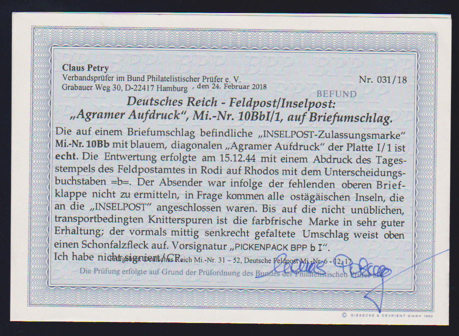 "INSELPOST", Rhodos durchstochen (kl. Knitter gebrauchsbedingt) auf sauberem Feldpostbrief, sign. Rungas. Mi. 400,-