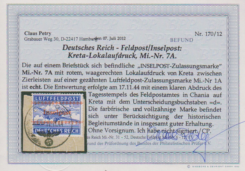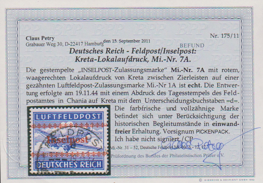 "Inselpost", Kreta gezähnt gestempelt in überdurchschnittlich guter Erhaltung, sign. Pickenpack und Fotoexp. Petry. Mi. 350,-