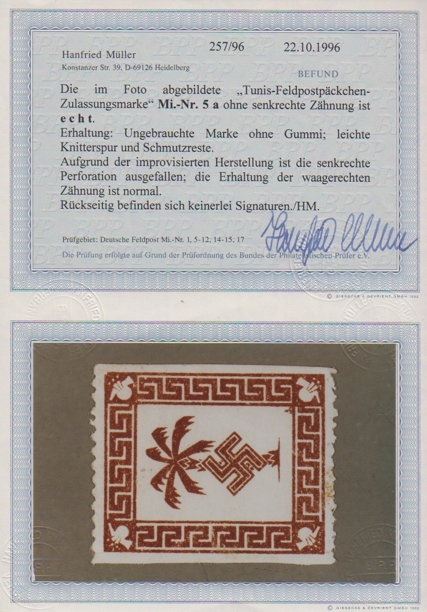 Tunis-Feldpost-Päckchenmarke mit Abart "senkrecht ungezähnt" ungebraucht (leichte Knitterspur), Fotoexp. Müller