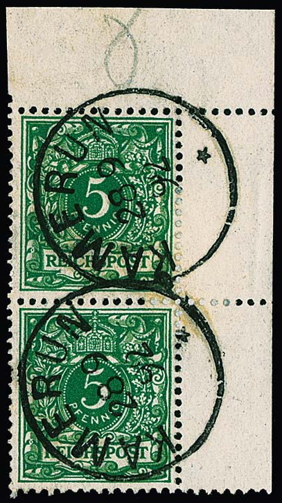 Vorläufer Krone-Adler 5 Pfg. im seltenen und sehr dekorativen Paar aus der rechten oberen Bogenecke mit K1 "Kamerun" vom 28.9.1892. Vorläufer-Bogenecken sind selten und ungewöhnlich, sign. R. Steuer