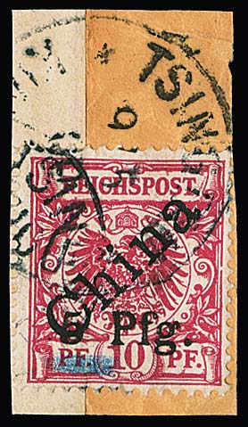 5 a. 10 Pfg., 1. Tsingtau-Aushilfs-Provisorium in der seltenen Variante mit kurzem Blaustrich auf Briefstück (von Streifband-Drucksache) mit Stempel "Tsingtau" vom Ersttag, eine seltene Marke. Attest Jäschke-L. Mi. 10.000,-