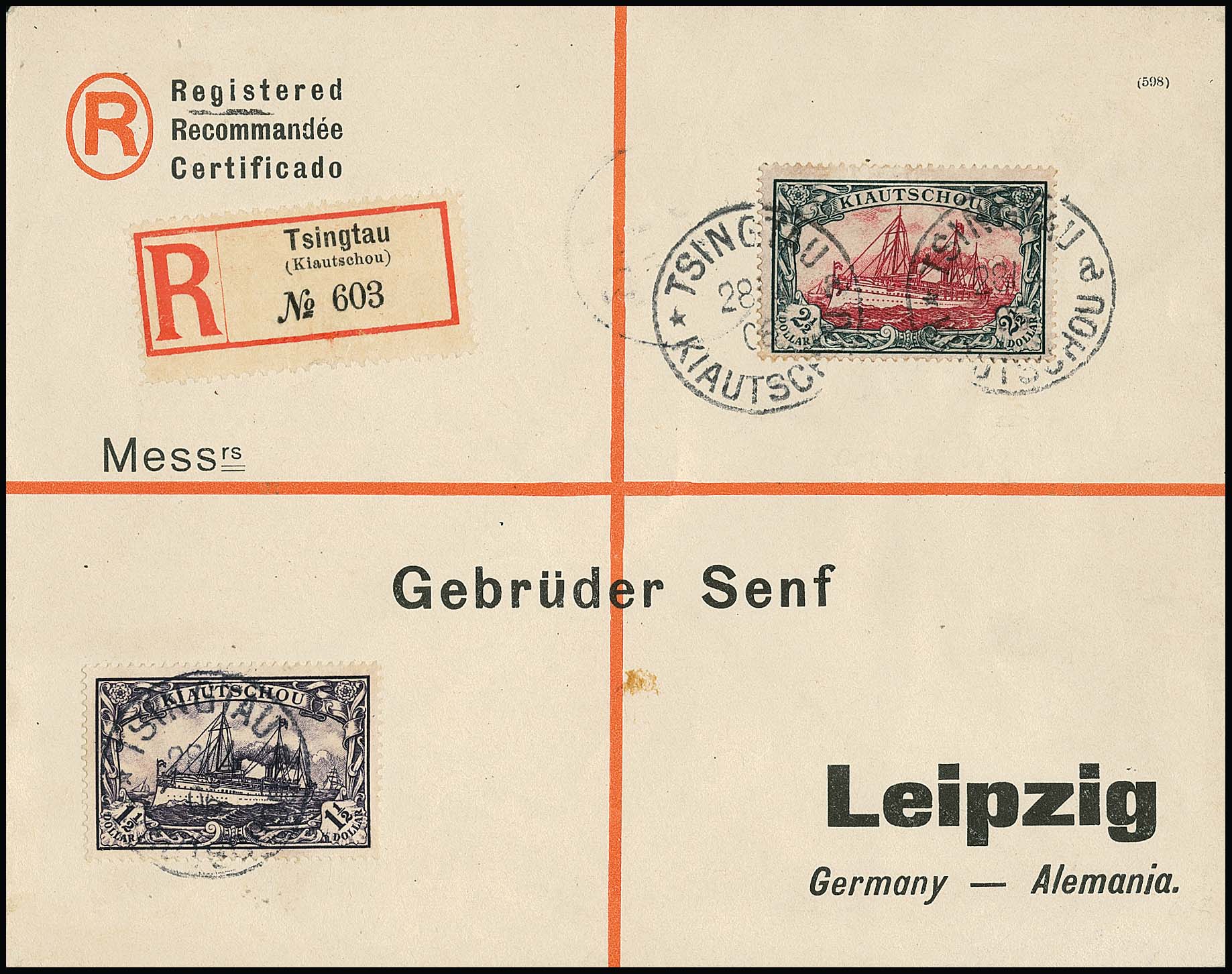 1 1/2 und 2 1/2 Dollar Kaiseryacht je in Zähnung "26:17 Zähnungslöcher" auf sauberem R-Brief von Tsingtau 1906 nach Leipzig. Sign. Horst Krause, der die Marken zur Prüfung gelöst, wie immer gewaschen und dann zurückgeklebt hat, was die im Attest Jäschke-L. beschriebenen "optischen Aufheller" erklärt. Ein seltener und dekorativer Brief. Mi. 11.000,-