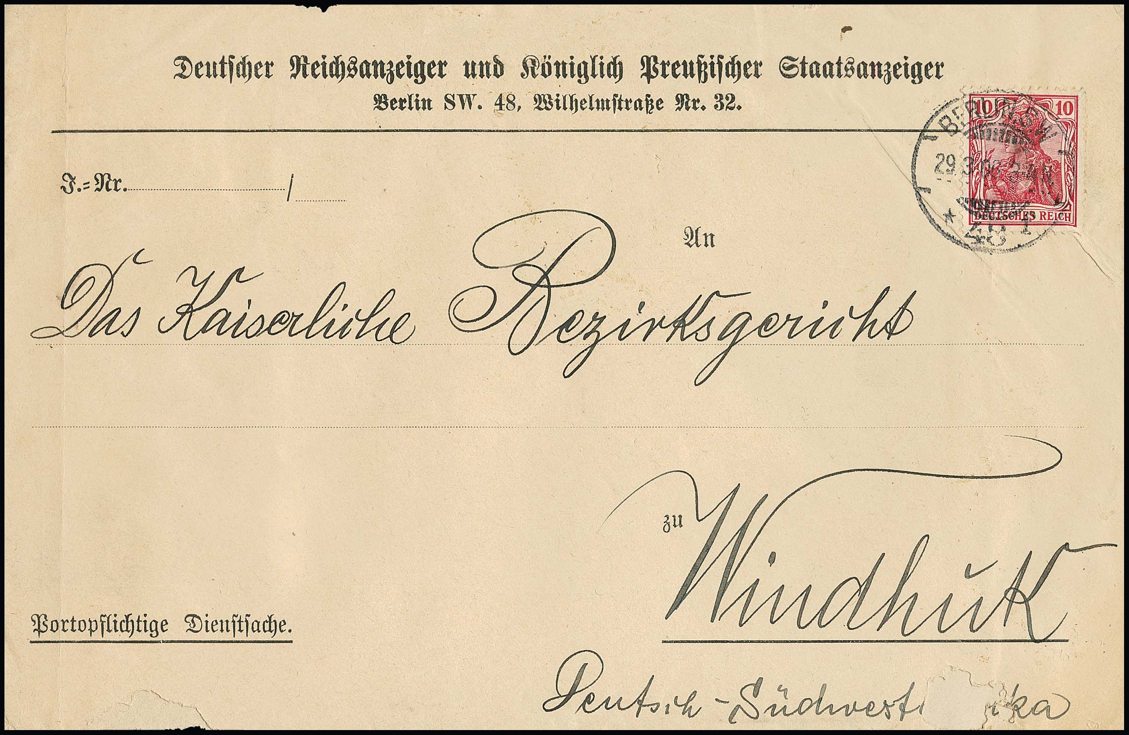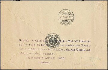 Termitenpost, Windhuk 1906, sechszeiliger, violetter Gummi-Typensatzstempel des Postamts Windhuk: "Sendung stammt aus einer am 4. d. Mts. bei Okasise aufgefundenen Briefpost, die teilweise von Termiten beschädigt worden ist. Die näheren Umstände sind noch nicht bekannt, Windhuk, 5. August 1906, Postamt" rückseitig auf aus Berlin eingegangenem Brief mit Germania 10 Pfg. an das Kaiserliche Bezirksgericht in Windhuk. Der Brief wurde befördert mit Dampfer "Ernst Woermann" am 30.3.1906 ab Hamburg. Nach Ankunft in Swakopmund mit der Bahn nach Windhuk transportiert, wobei auf der Strecke der Postsack, in dem sich auch dieser Brief befand, vom Waggon viel. Dieser Sack wurde erst am 4. August 1906 nach langer Suche gefunden, wobei die enthaltenen Postsachen einen mehr oder weniger starken Termiten-Befall aufwiesen. Um die Schäden und die verzögerte Zustellung zu erklären, stempelte das Postamt Windhuk die Belege mit dem sechszeiligen Gummi-Typensatzstempel nebst Eingangsstempel "WINDHUK 5.8.06". Bisher sind nur fünf Briefe der sog. "Termiten-Post" bekannt, wobei der hier angebotene den mit Abstand deutlichsten und vollständigsten Abschlag des Typensatzstempels aufweist und zugleich relativ geringe Fraßschäden zeigt. Eine postgeschichtliche Rarität ersten Ranges. Im ArGe-Katalog mit "LP" bewertet