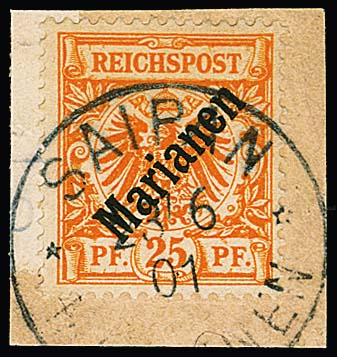 25 Pfg., diagonaler Aufdruck, auf Briefstück mit klarem Stempel "Saipan" 1901. Sign. Dr. Lantelme, Pfenninger, Fulpius und Attest R. Steuer. Mi. 3200,-