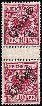 5 Pfg. a. 10 Pfg., Abart "ohne Blaustrich", im ungebrauchten senkrechten Zwischenstegpaar, obere Marke in Aufdrucktype 3, untere Type I, diese Kombination kommt nur dreimal im Bogen vor. Die obere Marke war abgetrennt, die untere leichter Bug, in dieser Form sehr selten. Attestkopien Bothe und Mansfeld für zerteilte Einheit sowie Attest R. Steuer