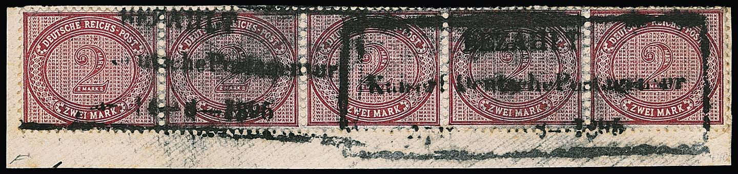Vorläufer 2 Mk. rotkarmin im Fünferstreifen auf Briefstück mit klarem Postagentur-Ra3 "Bezahlt Kaiserl. Deutsche Postagentur Apia 14.8.1895", der in 1895 nur kurzzeitig wieder in Gebrauch war. Die rechte Marke des Streifens rechts oben kleiner Zahnlochspalt, sonst gut. Auf einer Einheit (lose normale Vorläufer-Marken = 1750,- Michel) seltene Abstempelung. Attest Jäschke-L.