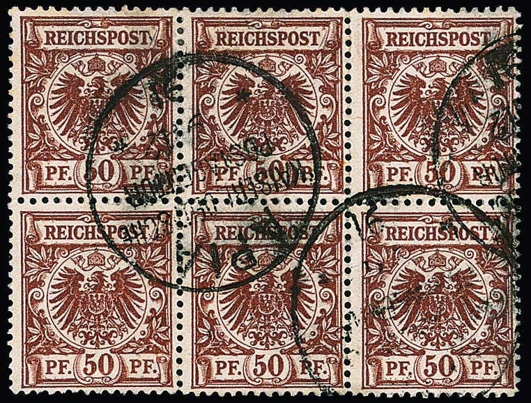 Vorläufer Krone-Adler 50 Pfg. in guter Farbe braunrot im seltenen Sechserblock mit K1 "Apia" vom 9.12.1891, gering angetrennt (ohne Bedeutung). Michel der losen Marken schon 3000,- (!), Attest Jäschke-L.