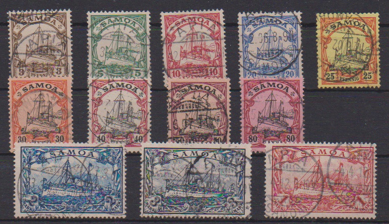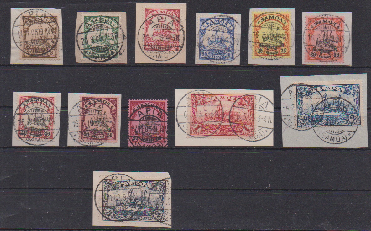 Kaiseryacht, komplette Serie auf Briefstücken mit Stempel "Apia", billige 50 Pfg. Bug, ab 25 Pfg. alle sign. Bothe. Mi. 1000,-