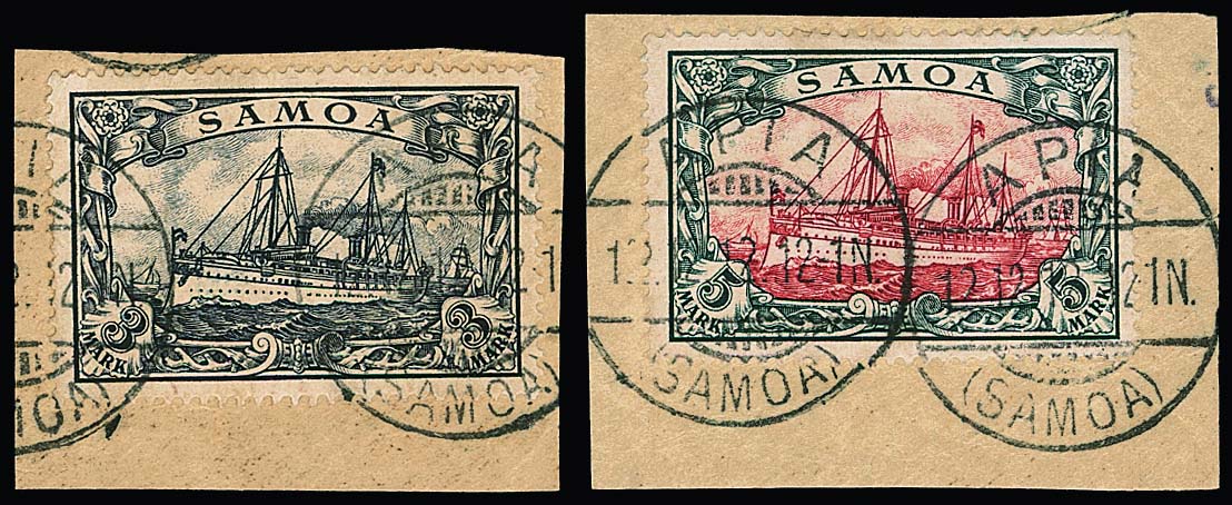 3 und 5 Mk. Kaiseryacht je auf sauber gestempelten Briefstücken ("Apia"), Höchstwert Attest Jäschke-L. Mi. 770,-