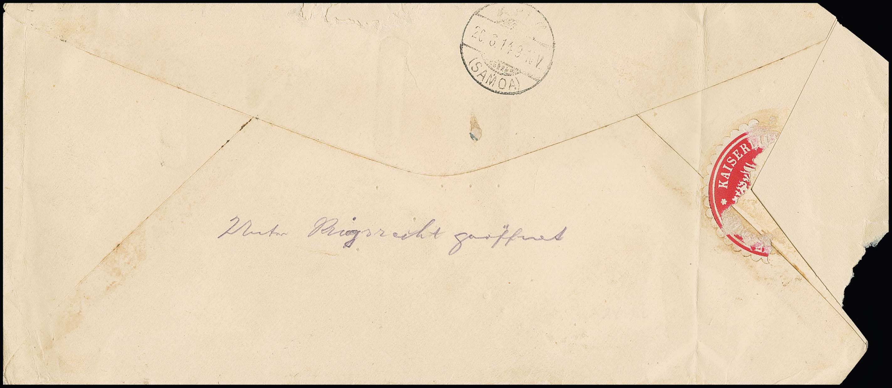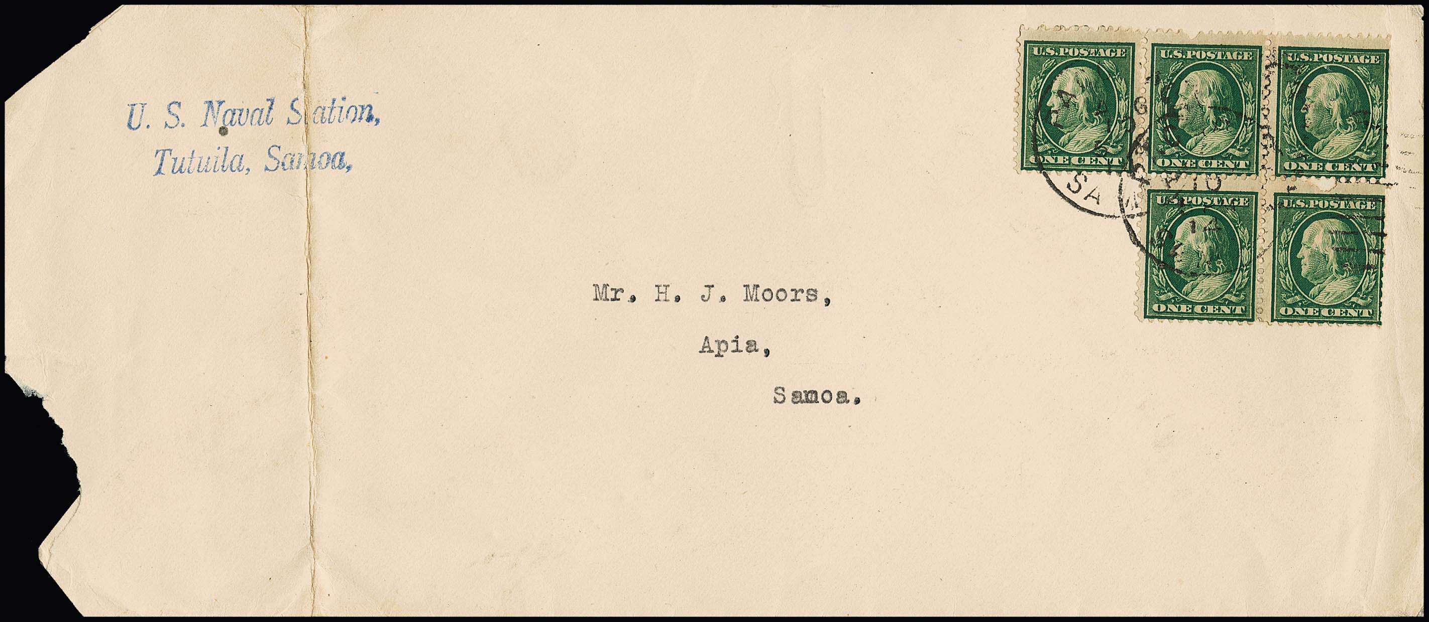 Samoa-Kriegspost, Brief USA-Post mit fünfmal 1 C. grün (kl. Zf.) von der US-Naval-Station auf Tutuila/Samoa nach Apia/Samoa vom 10. August 1914 (Ankunft 20.8.1914), hs. "unter Kriegsrecht geöffnet" mit rückseitiger Siegelmarke der Kaiserlichen Post in Samoa (diese durch Brieföffnung nur noch rudimentär), sehr seltene Kriegspost mit Zensur, ArGe "LP"