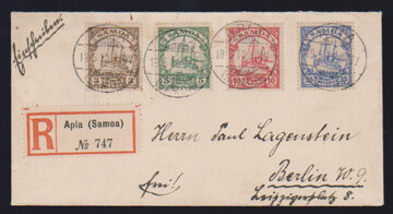 3 bis 20 Pfg. kpl. auf R-Brief von Apia 1910 nach Berlin