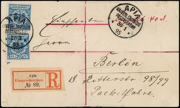 Vorläufer 20 Pfg. Krone-Adler per zwei in "Mischfrankatur" mit Barzahlung, handschriftlich "bezahlt 40 Pfg.", als Einschreibebrief nach Berlin. Seltene nachträgliche Frankierung, erst am 30.1.95 in Apia mit hs. Barfrankierung aufgeliefert und dann am 27.2.95 nach Eintreffen der neuen Marken-Lieferung mit den beiden 20 Pfg. nachfrankiert und versandt. Brief Adreßname radiert