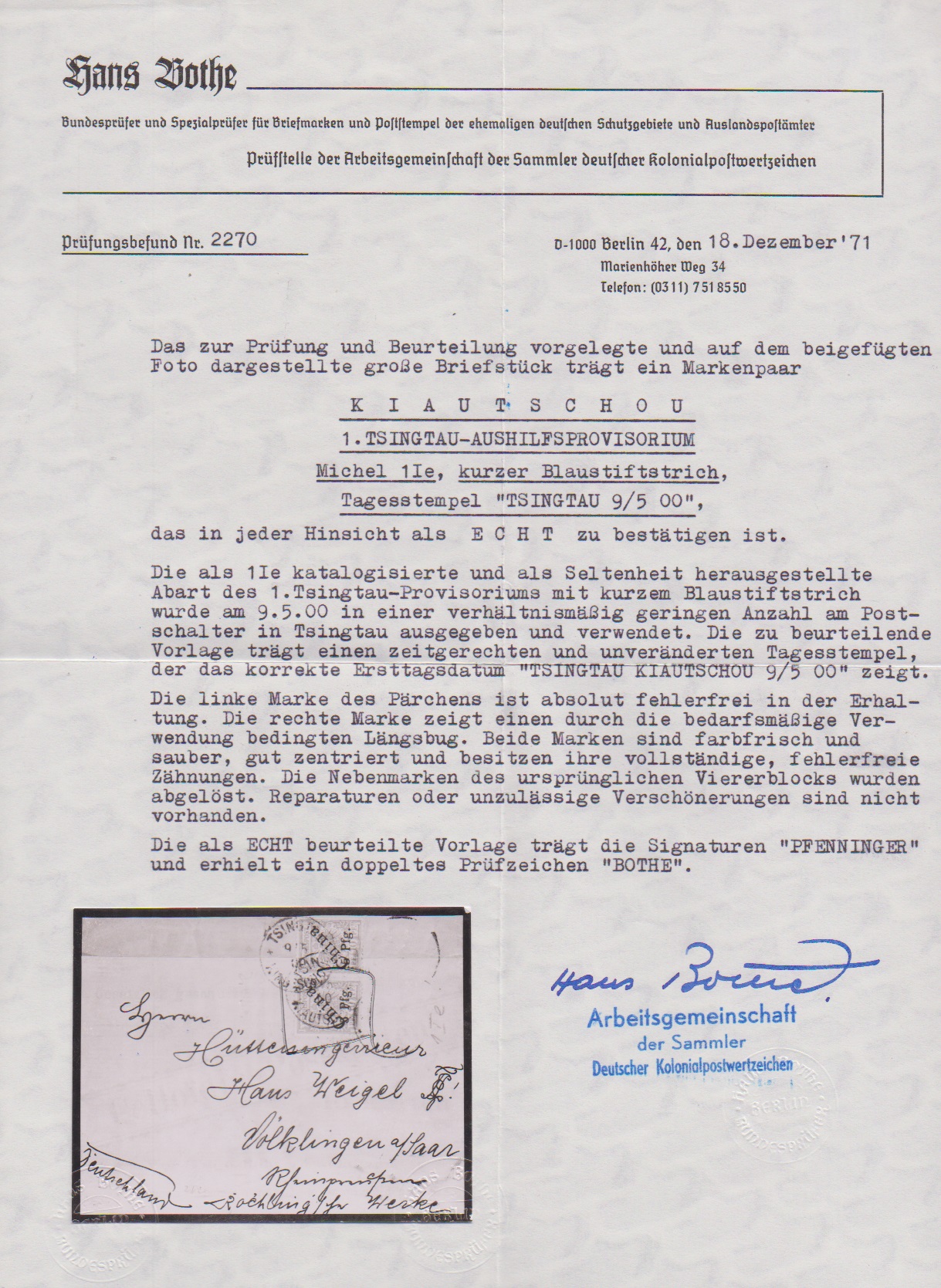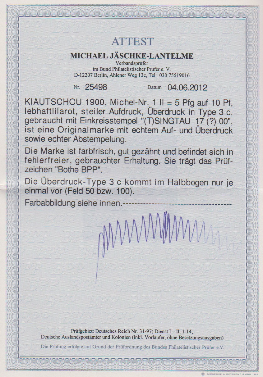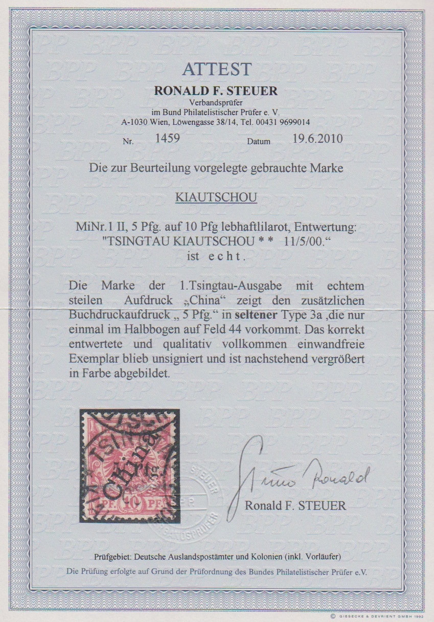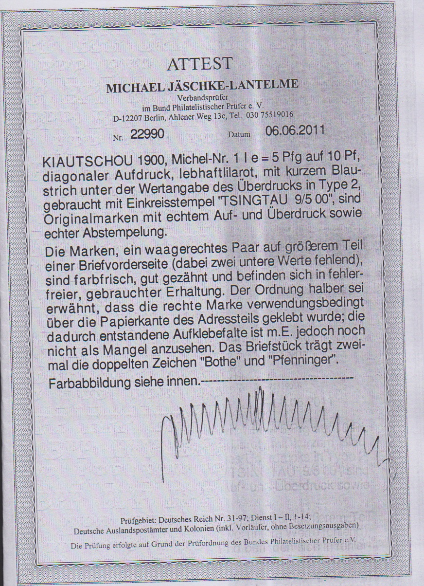 5 a. 10 Pfg., 1. Tsingtau-Aushilfs-Provisorium (rechts Zahnfehler) auf Briefstück vom Ersttag. Atteste Bothe und Jäschke-L. (Kopie) für geteiltes Paar. Mi. 10.000,-