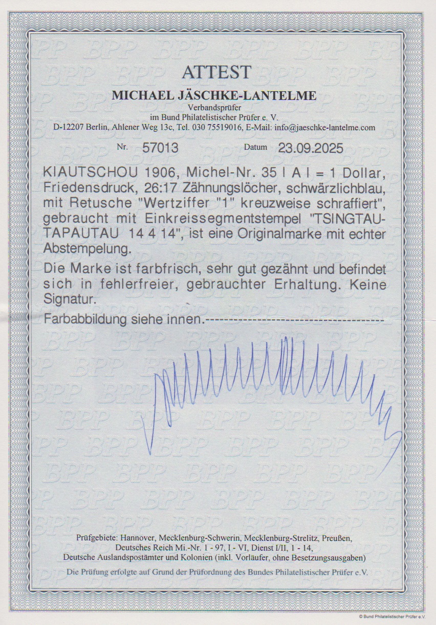 1 Dollar Kaiseryacht mit Plattenfehler "Retusche" ("1 kreuzweise schraffiert") tadellos gestempelt, Attest Jäschke-L. Mi. 500,-