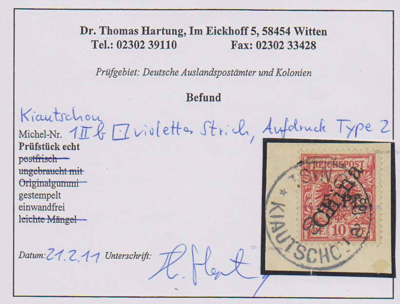 5 Pfg. a. 10 Pfg., Überdrucktypen 2 (Briefstück, Fotoexp. Hartung) und 3 (sign. Jäschke-L.) je mit violettem Strich gestempelt. Mi. 300,- +