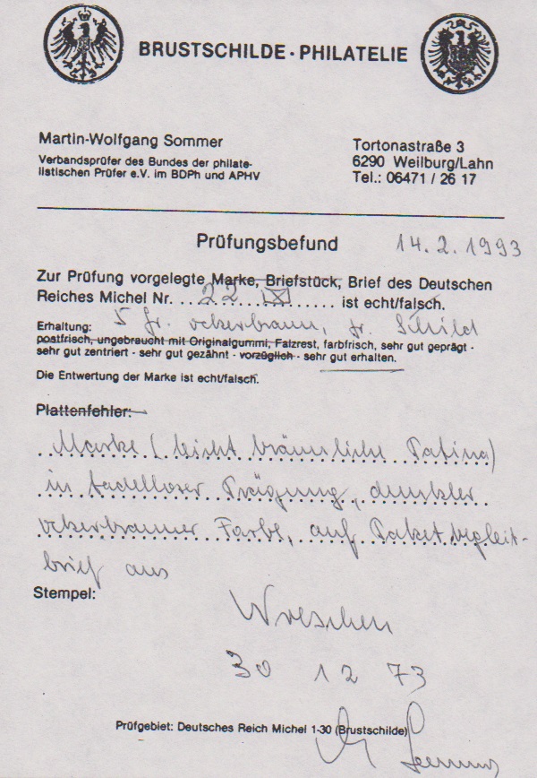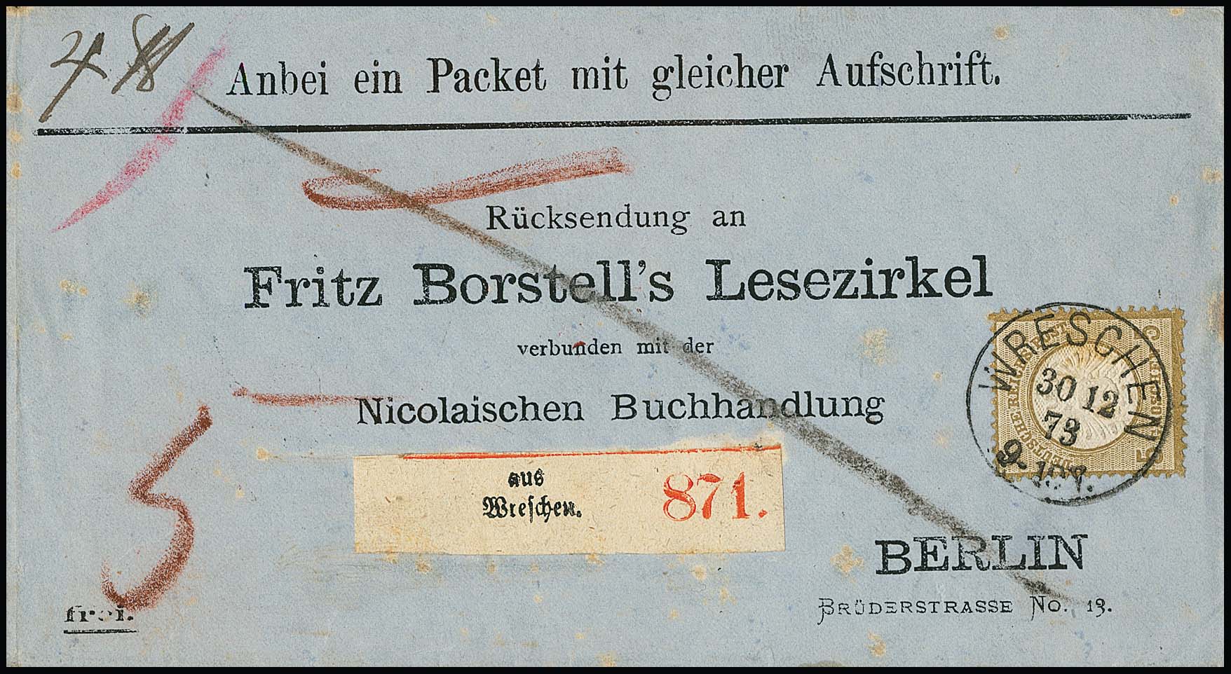 5 Gr. ockerbraun mit interessantem Plattenfehler "schräger Strich im Unterrand" auf vorgedrucktem Paketbegleitcouvert mit K1 "Wreschen" an einen Lesezirkel in Berlin. Etwas Patina, Befund Sommer