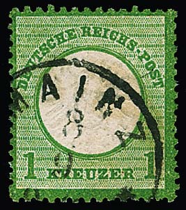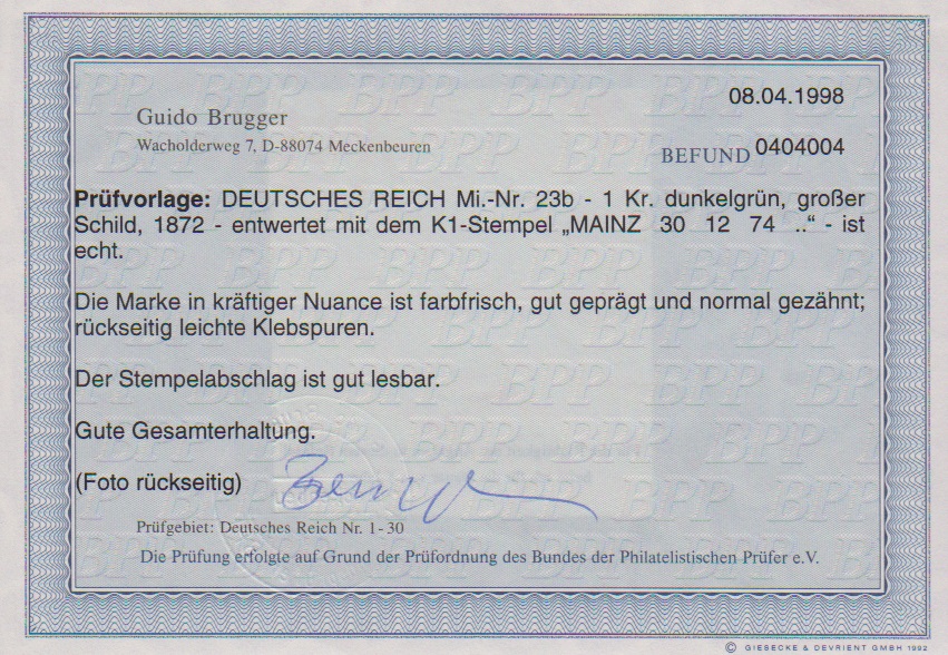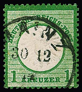 1 Kr. dunkelgrün, Prachtstück mit K1 "Mainz" vom 30.12.74 (vorletzter Tag der Gültigkeit), Fotoepx. Brugger. Mi. 800,-