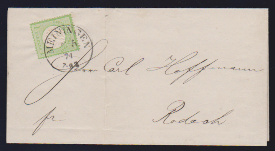 1 Kr. grün und 7 Kr. blau, frische Kabinettstücke auf Drucksache (K1 "Meiningen") bzw. Doppelbrief aus Sachsenhausen