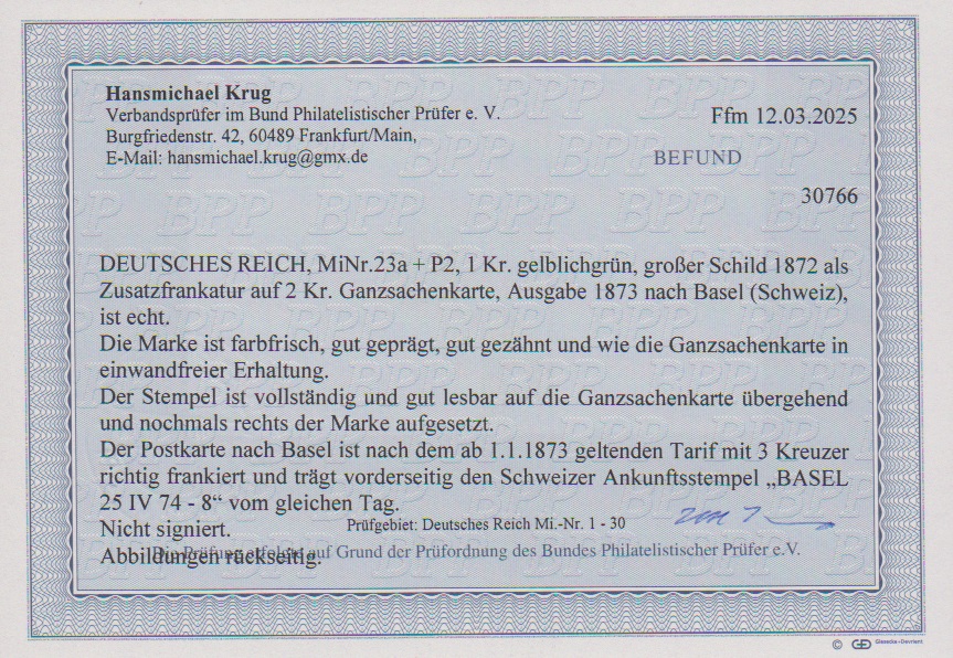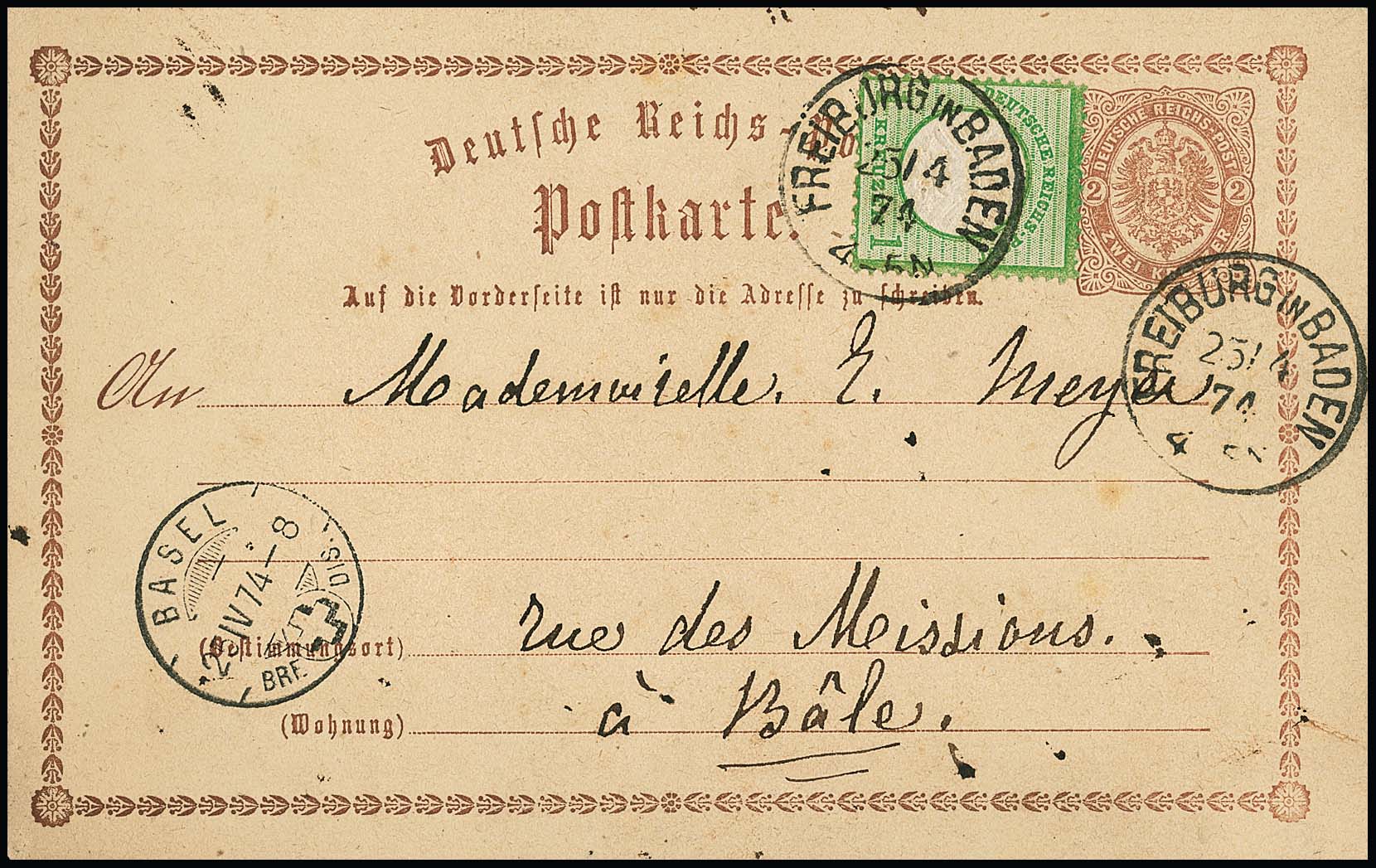 1 Kr. grün, Kabinettstück auf Ganzsachenkarte 2 Kr. braun, von Freiburg 1874 nach Basel gelaufen, obwohl Grenzrayon, zum normalen Postkartenporto. Fotoexp. Krug "einwandfrei"
