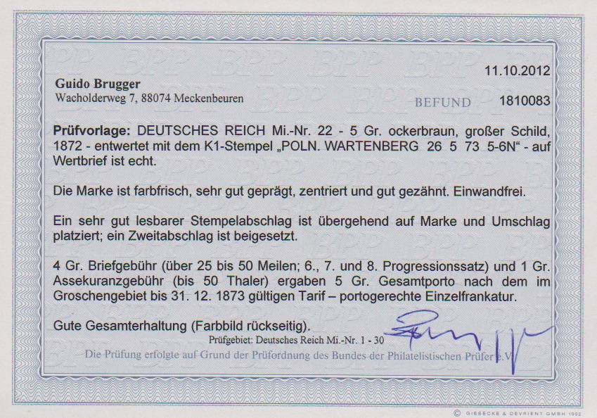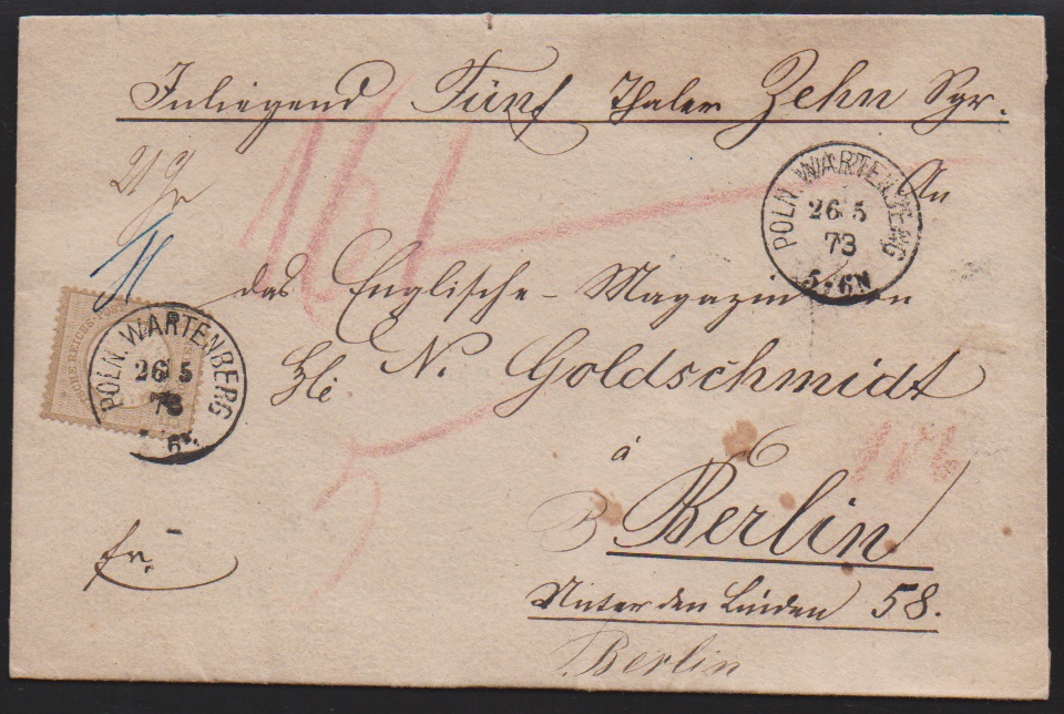 5 Gr. ockerbraun, perfektes Exemplar auf Wertbrief mit K1 "Poln. Wartenberg" 1873 nach Berlin, Fotoexp. Brugger