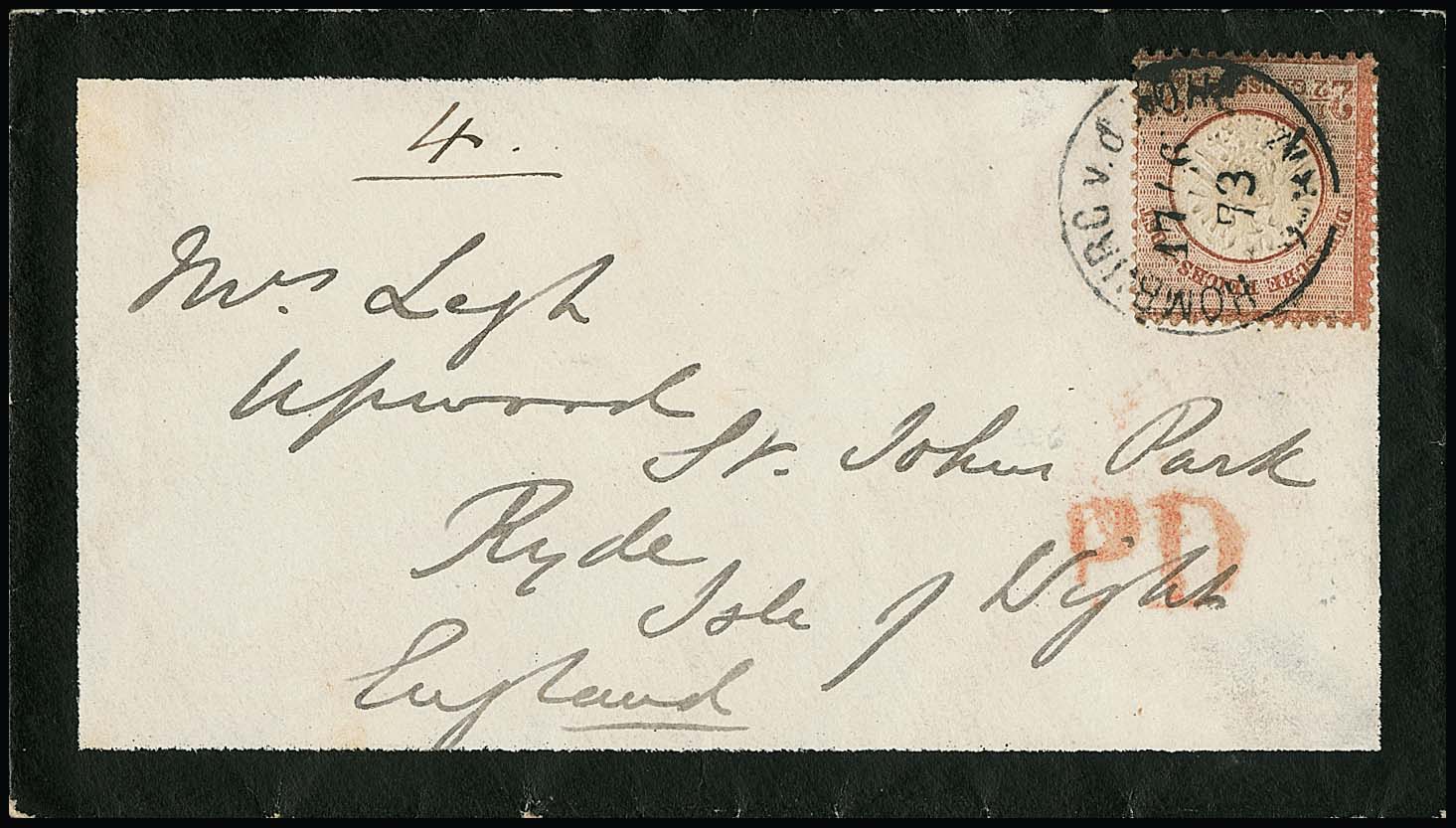 2 1/2 Gr. rotbraun einzeln mit K1 "Homburg v.d. Höhe" auf schwarz gerandetem Trauercouvert 1873 auf die Isle of Wight