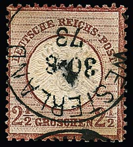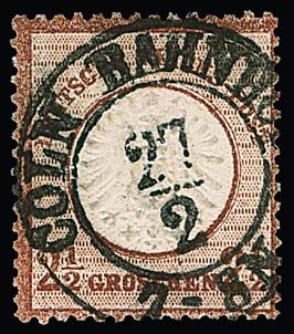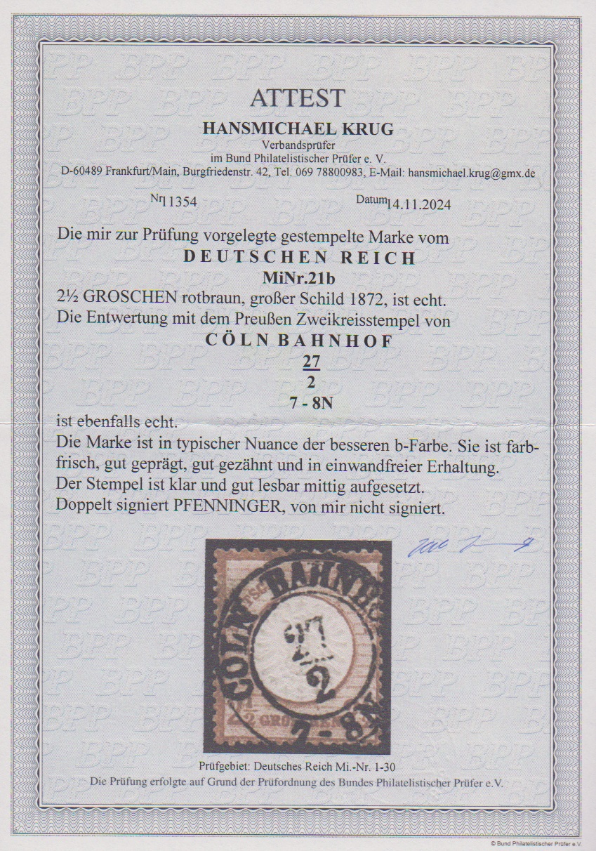 2 1/2 Gr. lilabraun, Kabinettstück mit zentrischem K2 "Cöln Bahnhof", sign. Pfenninger und Attest Krug. Mi. 600,-