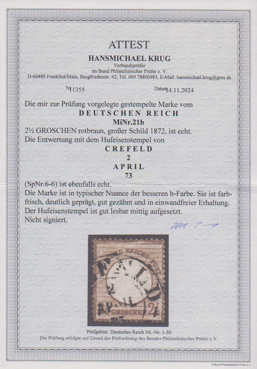 2 1/2 Gr. lilabraun, Kabinettstück mit Hufeisenstempel "Crefeld" (Spal. 6-6, typische Rheinland-Verwendung), Attest Krug. Mi. 600,-