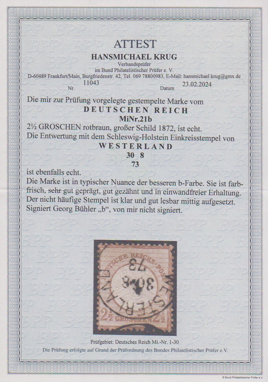 2 1/2 Gr. lilabraun, Kabinettstück mit hierauf ungewöhnlichem K1 "Westerland", Mi. 600,- + Stempel. Sign. Bühler und Attest Krug