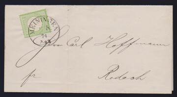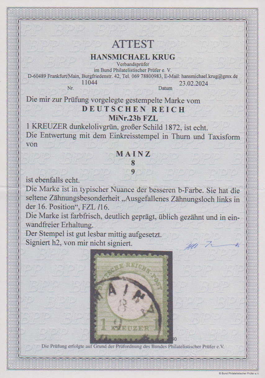 1 Kr. dunkelolivgrün, mit Besonderheit "FZl 16 links", Kabinettstück mit K1 "Mainz", Attest Krug. Mi. 800,- +