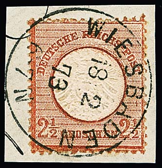 2 1/2 Gr. rotbraun auf Kabinettbriefstück mit vollem K1 "Wiesbaden", sign. Hennies