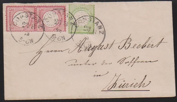 1 Kr. grün und Paar 3 Kr. rosa auf Pracht-Damencouvert von Constanz (K1) 1873 nach Zürich