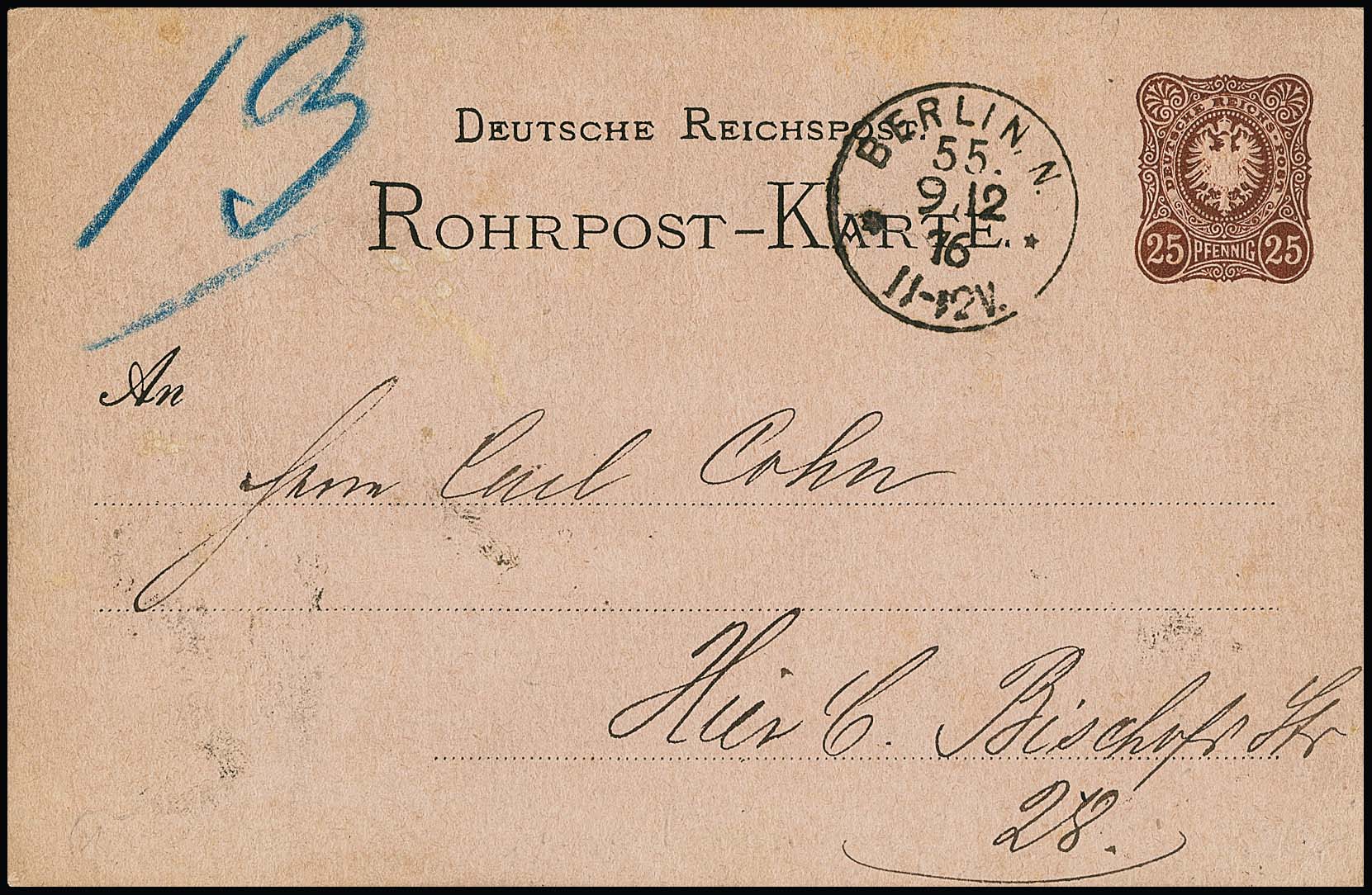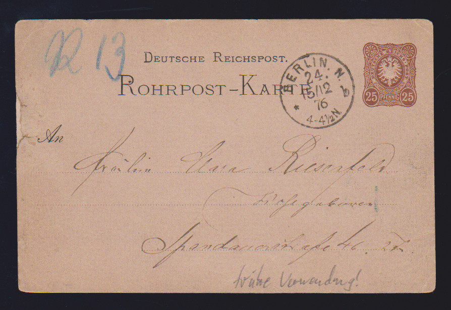 Rohrpost-Ganzsachenkarte 25 Pfg. braun sehr früh verwendet mit K1 "Berlin N. 55" vom 9.12.1876