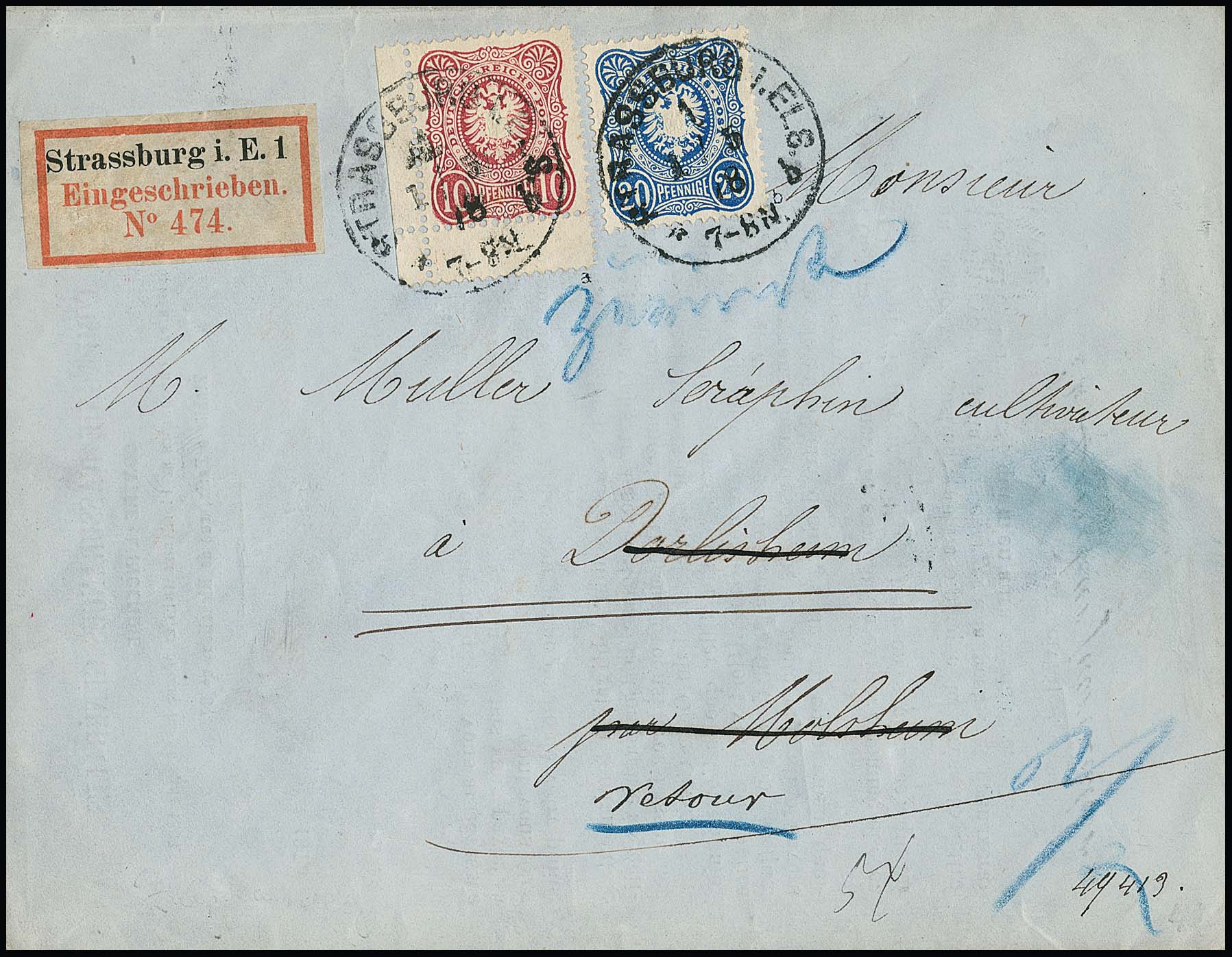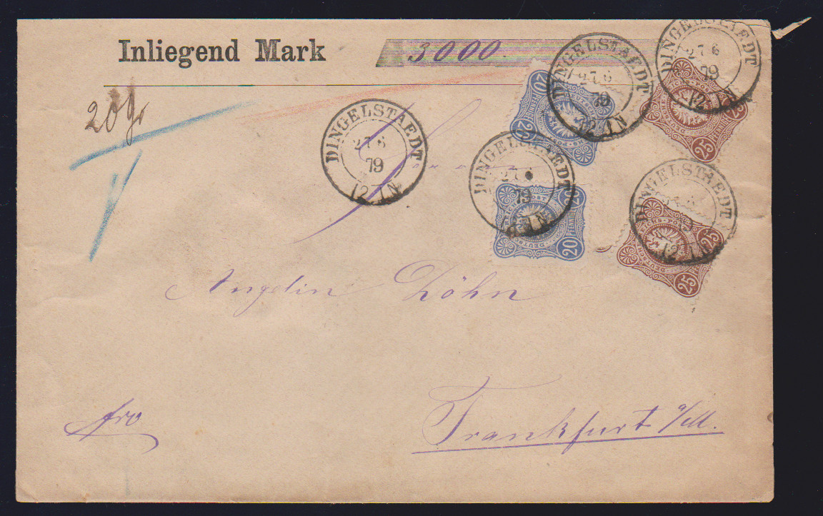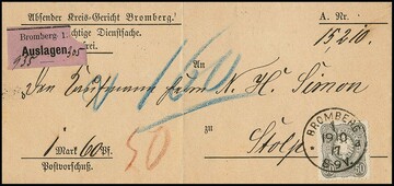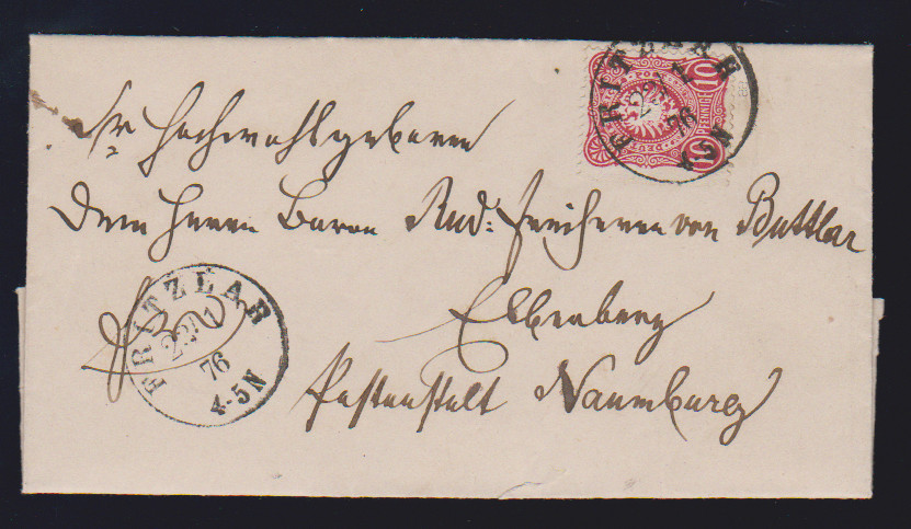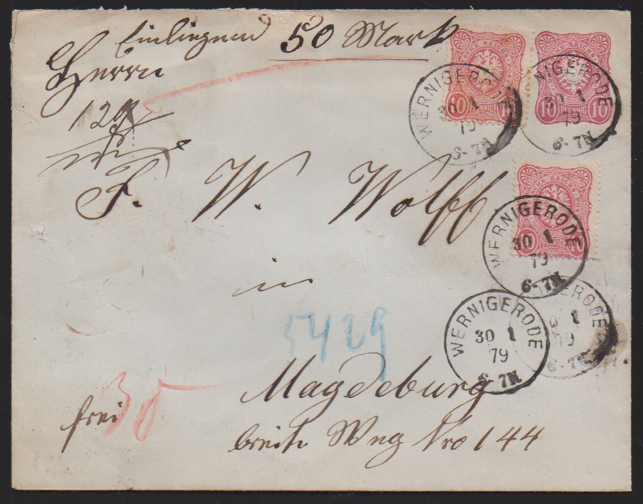 10 Pfge. rosa/karmin, fünf Briefe, u.a. per zwei auf Großformat-Wert-Ganzsache 10 Pfge., als Zwischenstegecke nebst 20 Pfg. auf Retour-R-Brief (sign. Wiegand), Nr. 33b in MiF mit Nr. 44a auf nachtax. (!) Paketbrief, sowie 10 nebst 50 Pfge. dunkelolivgrün auf Auslands-Einschreibebrief der 3. Gewichtsstufe von Cöln 1878 nach Paris, sign. Zenker