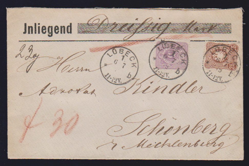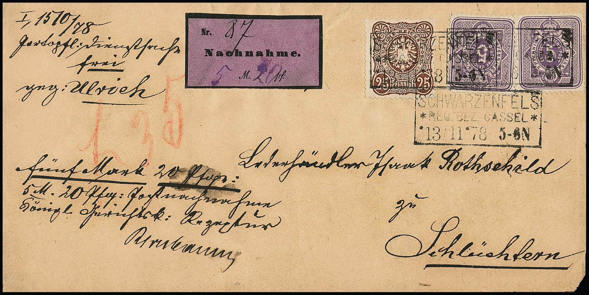 25 Pfge. dunkelbraun, tadellos, nebst zweimal 5 Pfge. purpur (eine etwas "eckrund"), auf Nachnahmebrief (leichte Gebrauchsspuren) mit Ra3 "Schwarzenfels Reg. Bez. Cassel", sign. Jäschke-L. Mi. 400,-