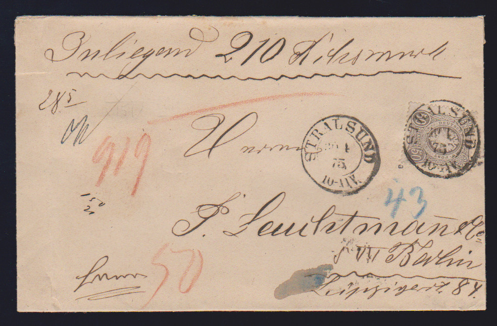 50 Pfge. dunkelgrau einzeln auf Wertcouvert 1875 mit K2 "Stralsund", sign. Zenker