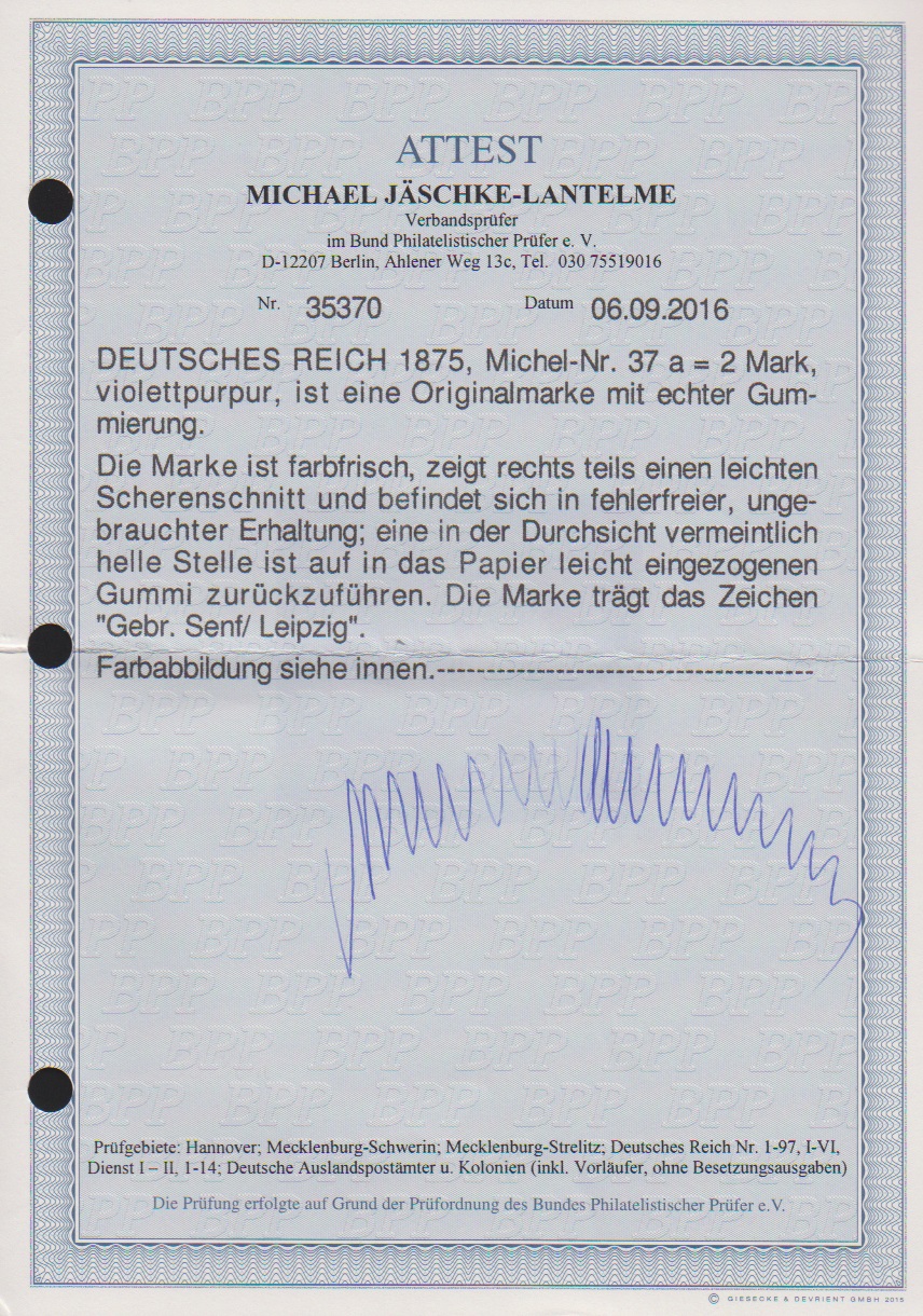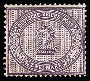 2 Mk. violettpurpur, die seltene Erstauflage ungebraucht, siehe Foto. Attest Jäschke-L. "in fehlerfreier ungebrauchter Erhaltung". Mi. 2500,-