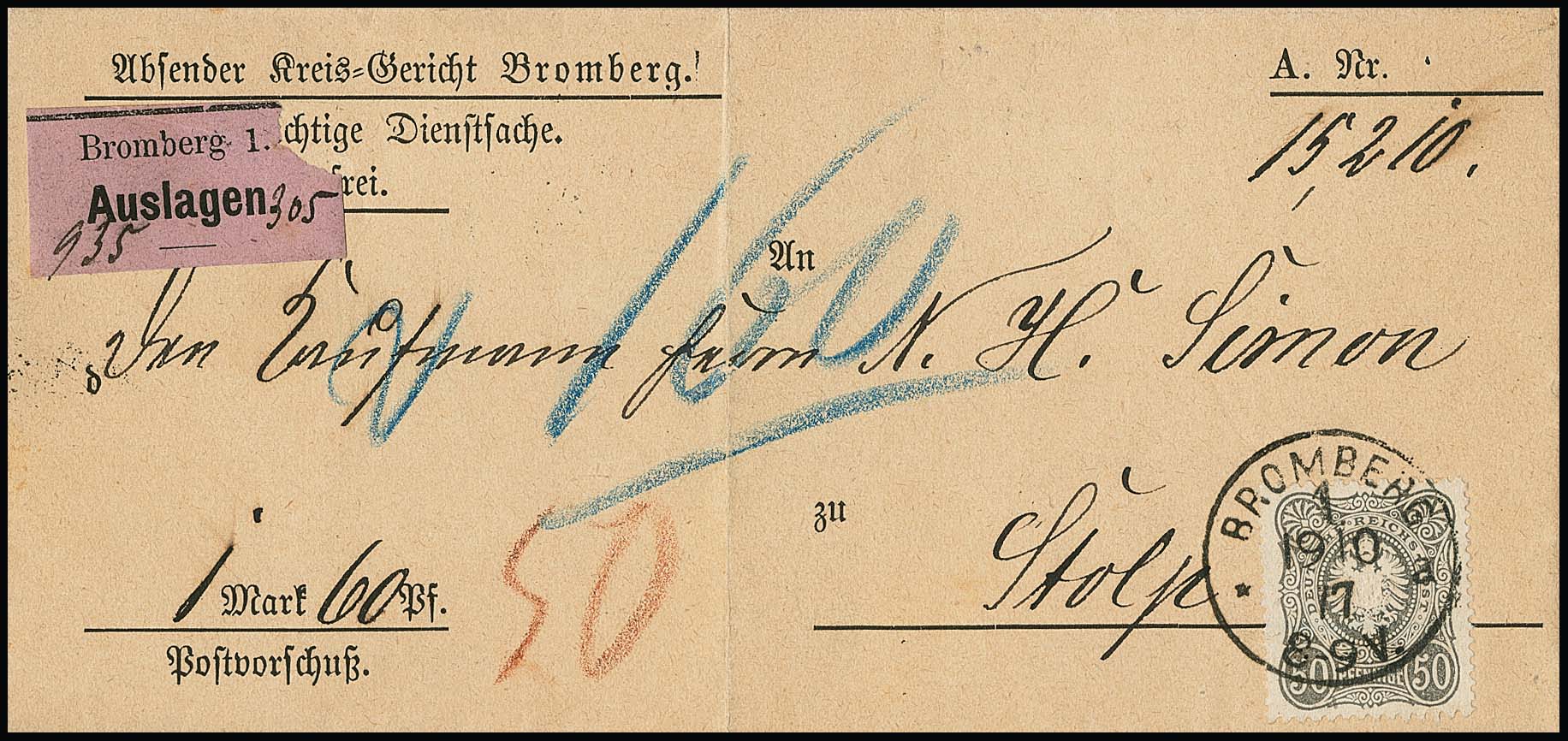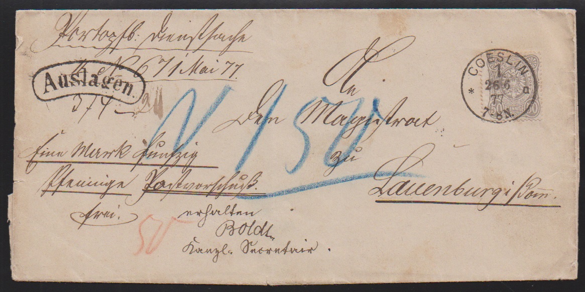 50 Pfge. grau, zwei Einzelfrankaturen auf "Auslagen"-Briefen (einmal violetter Zettel von Bromberg) aus 1877