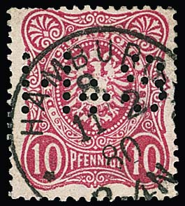 10 Pfge. rosa mit früher Firmenlochung "H+S" (Kafferösterei Hansen + Studt) gebraucht in Hamburg, dazu zwei frühe England-Werte um 1880 mit Perfin "FS & Co"