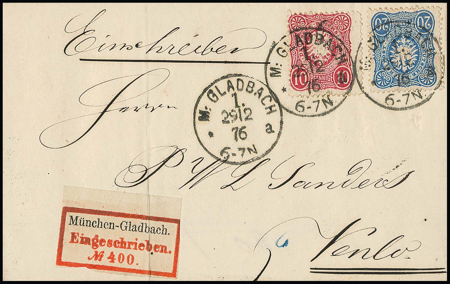 10 Pfge. rosa und 20 Pfge. blau auf seltenem eingeschriebenem Grenzrayon-Brief (Falte links ausserhalb) von Mönchengladbach 1876 nach Venlo