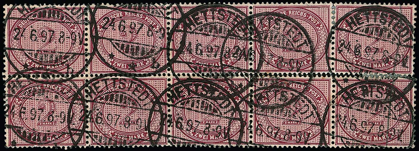 2 Mk. braunpurpur, seltener Zehnerblock mit typischer "Hettstedt"-Entwertung, angetrennt